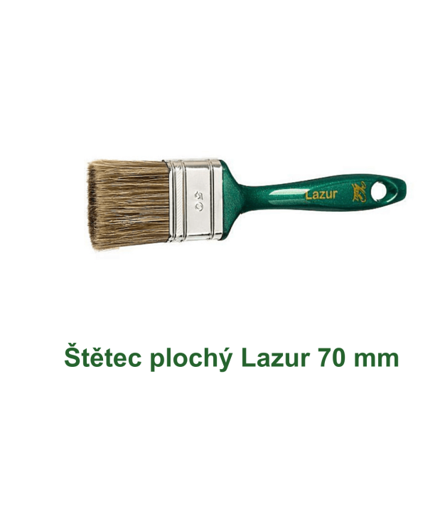 Plochý štětec Lazur 70 mm (3") je ideální pro rychlé a rovnoměrné nanášení lazur a dalších ochranných nátěrů na dřevo. Díky širšímu záběru se skvěle hodí na větší plochy, jako jsou terasová prkna, fasádní obklady, ploty, pergoly nebo podbití. Pevné zelené držadlo dobře padne do ruky a usnadní práci i při delším natírání.