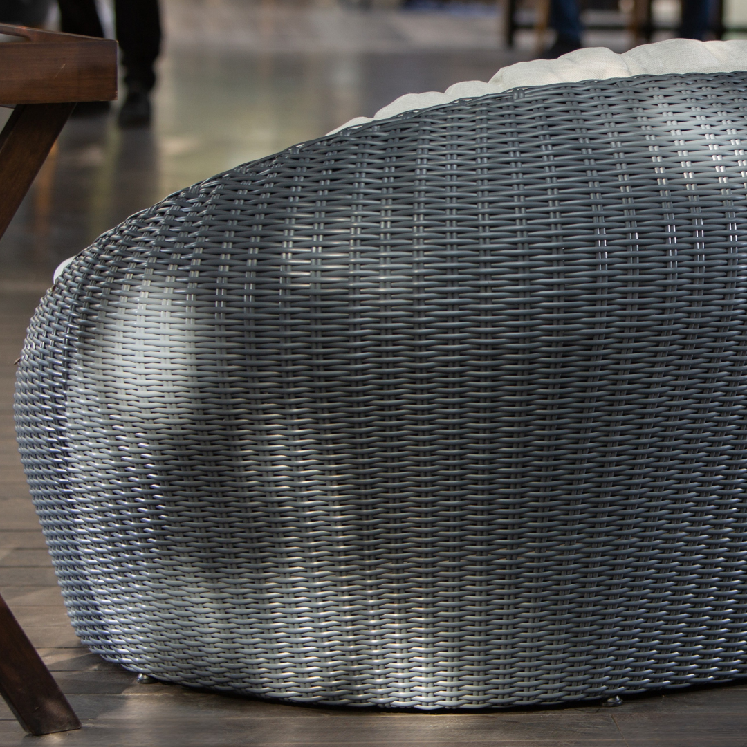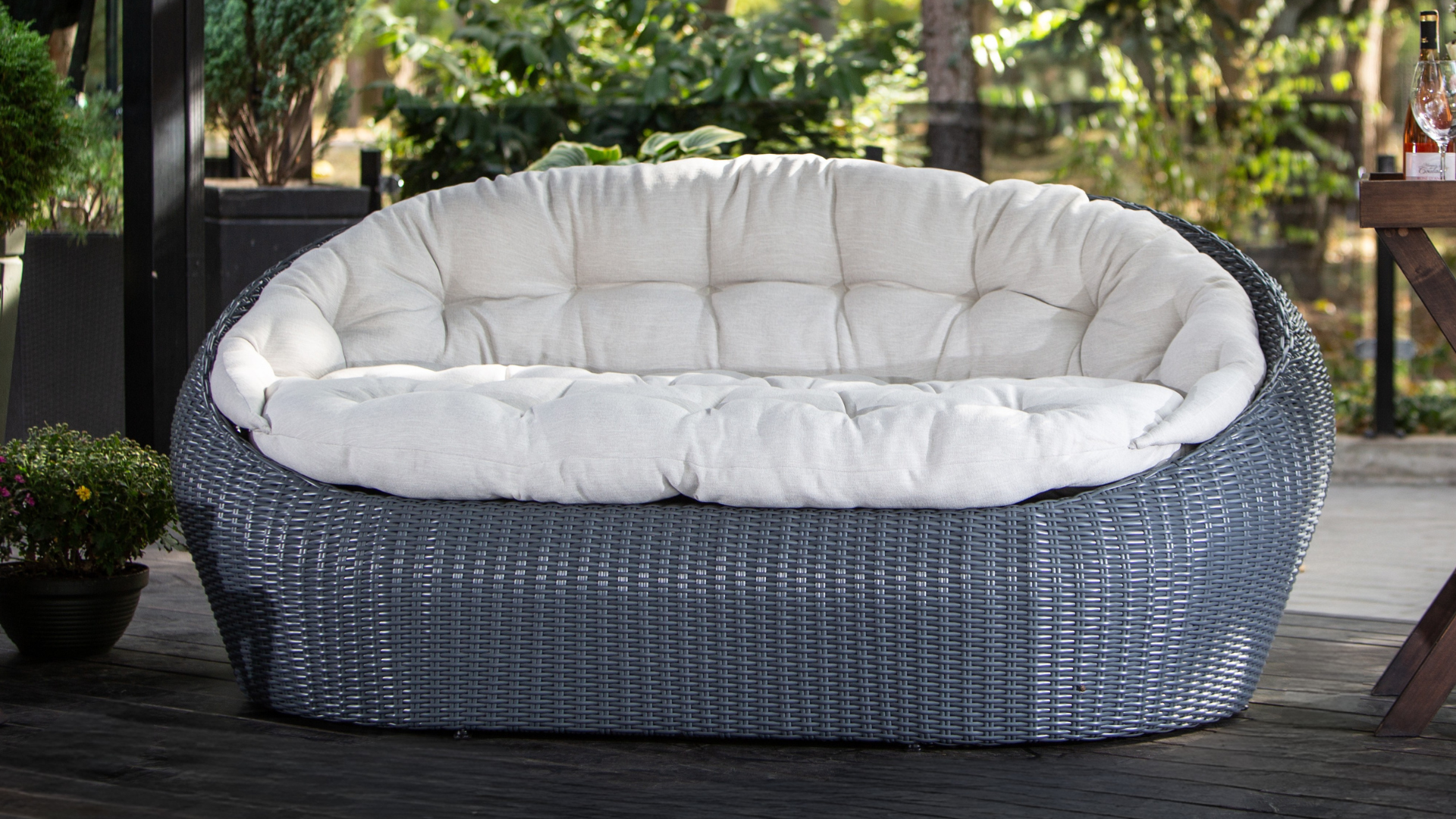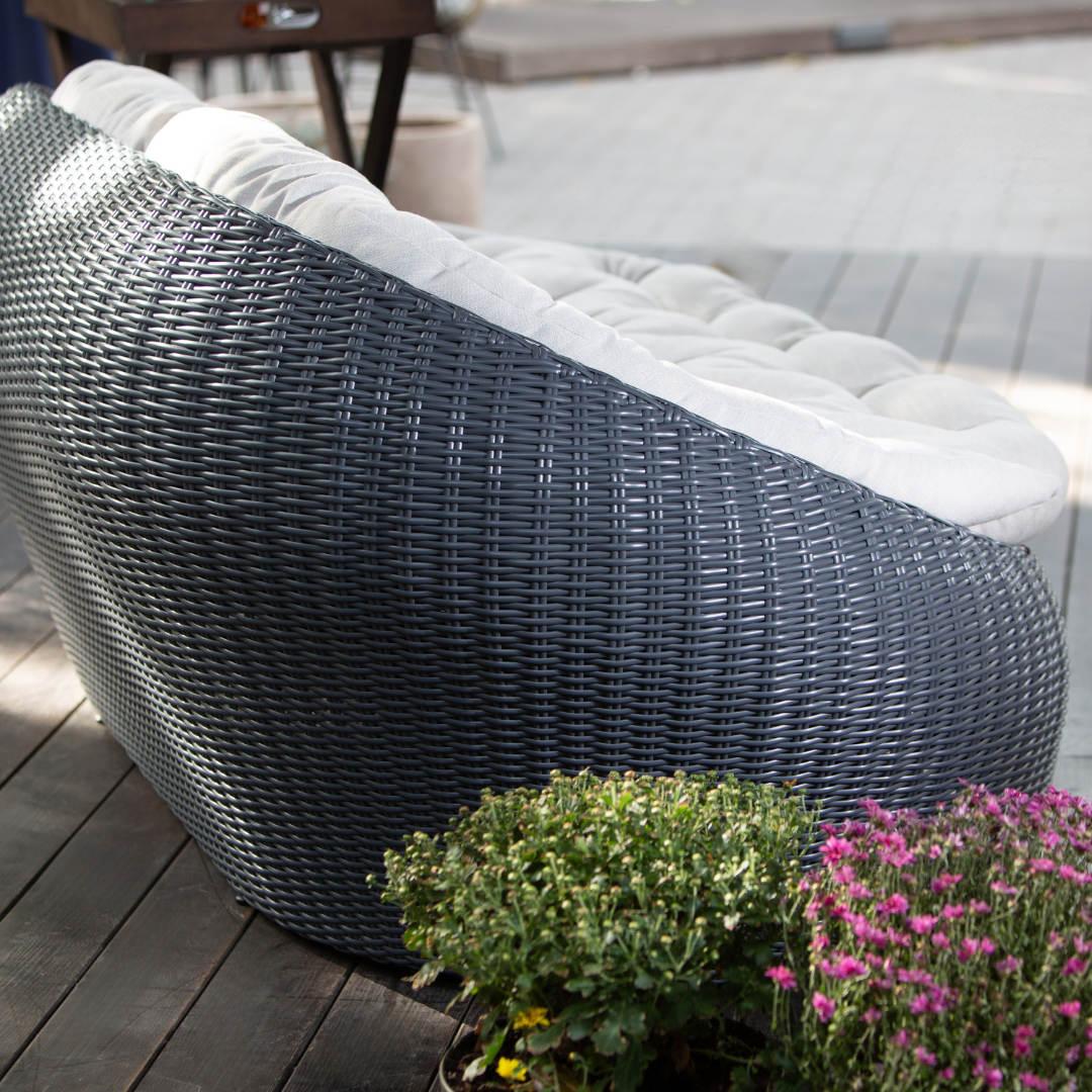 Velká dvoumístná pohovka z umělého ratanu PANDORA Terico. Ratan v grafitové barvě. Šedé polštáře a m