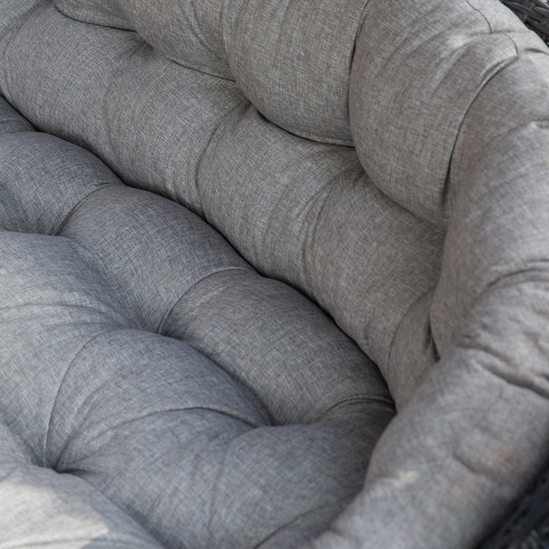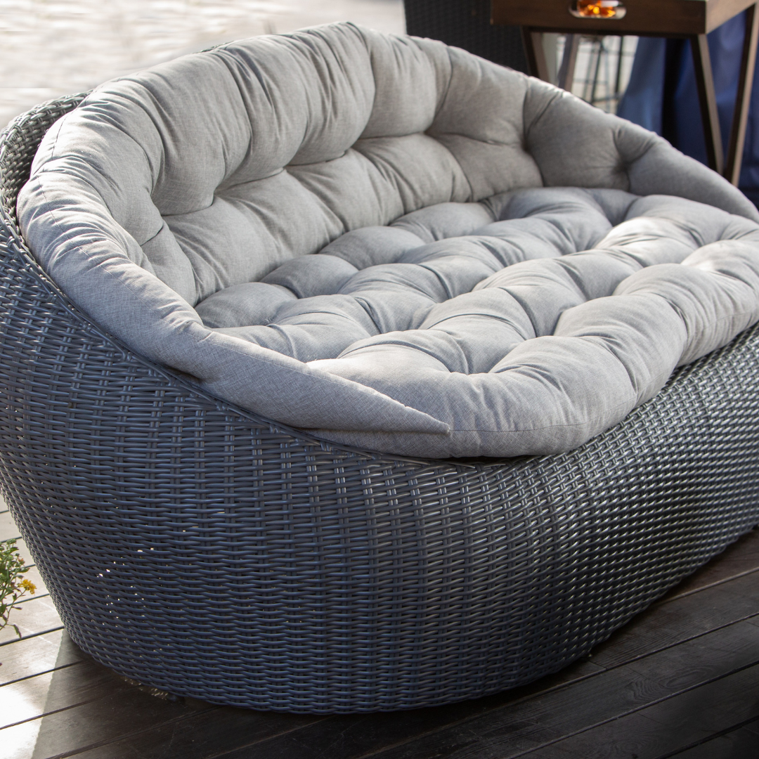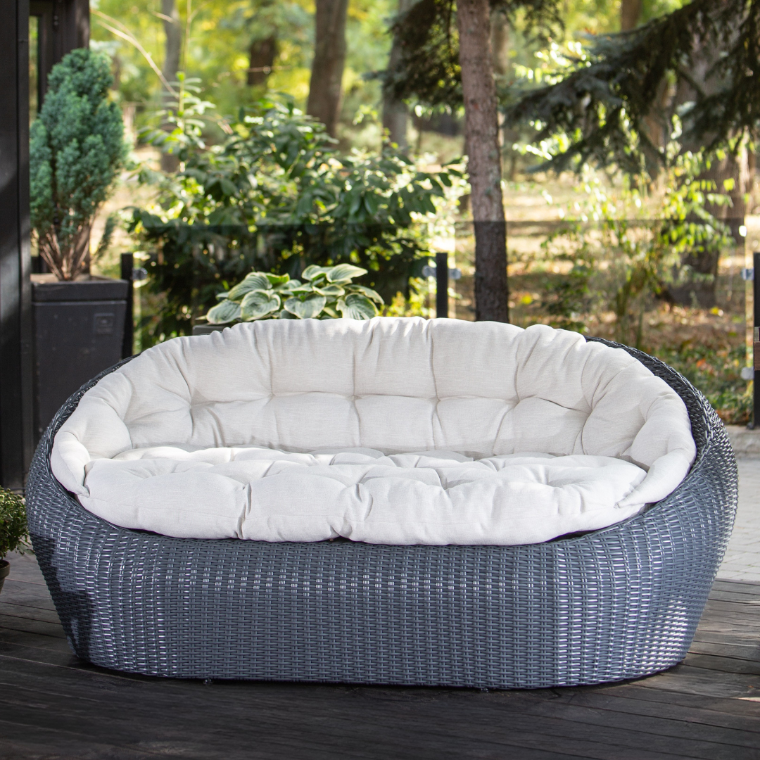 Velká dvoumístná pohovka z umělého ratanu PANDORA Terico. Ratan v grafitové barvě. Šedé polštáře a m