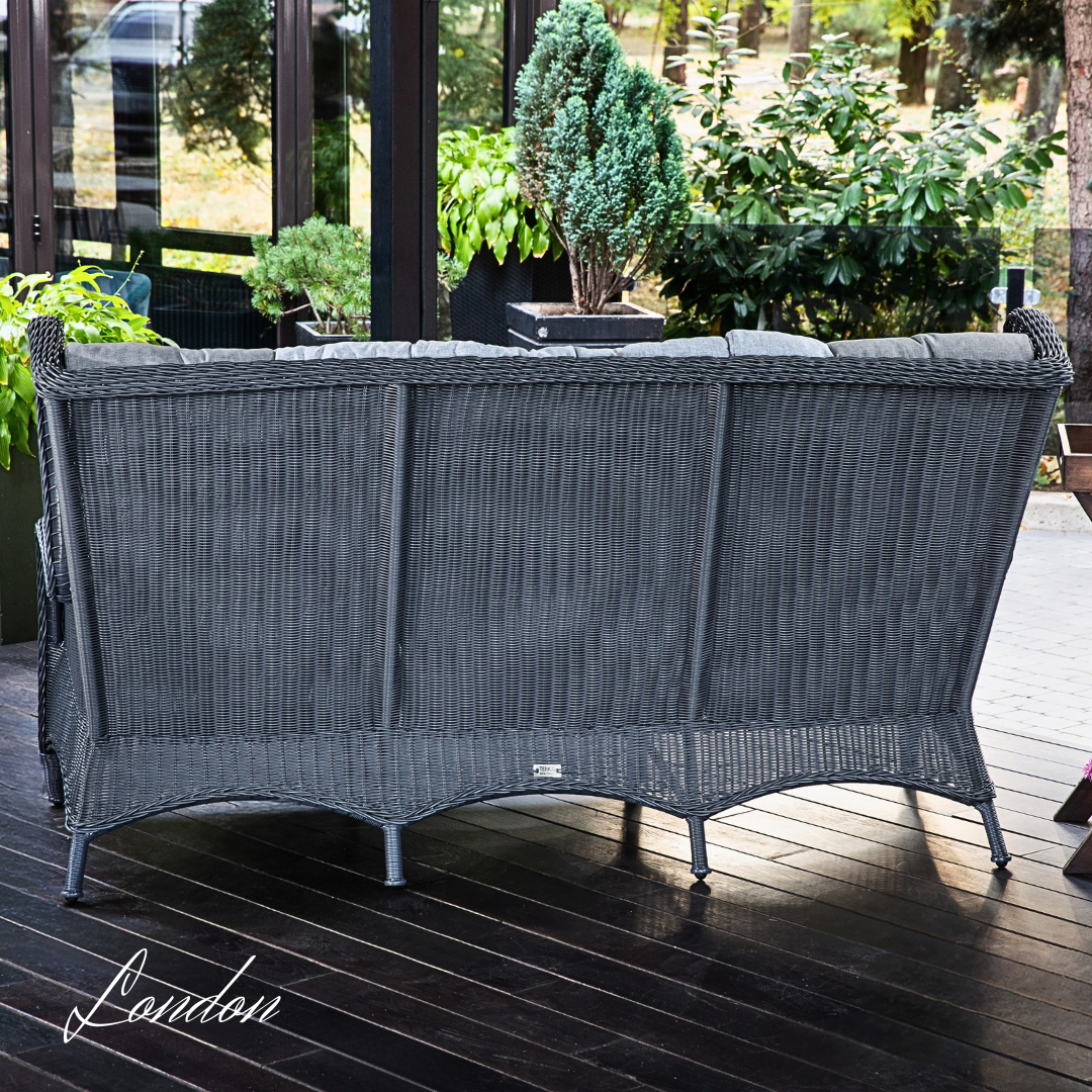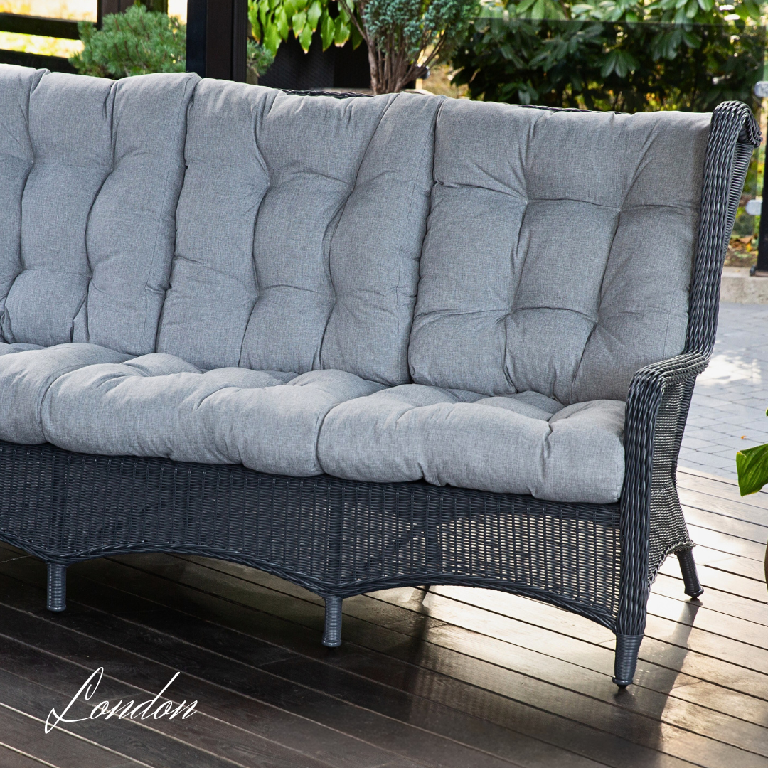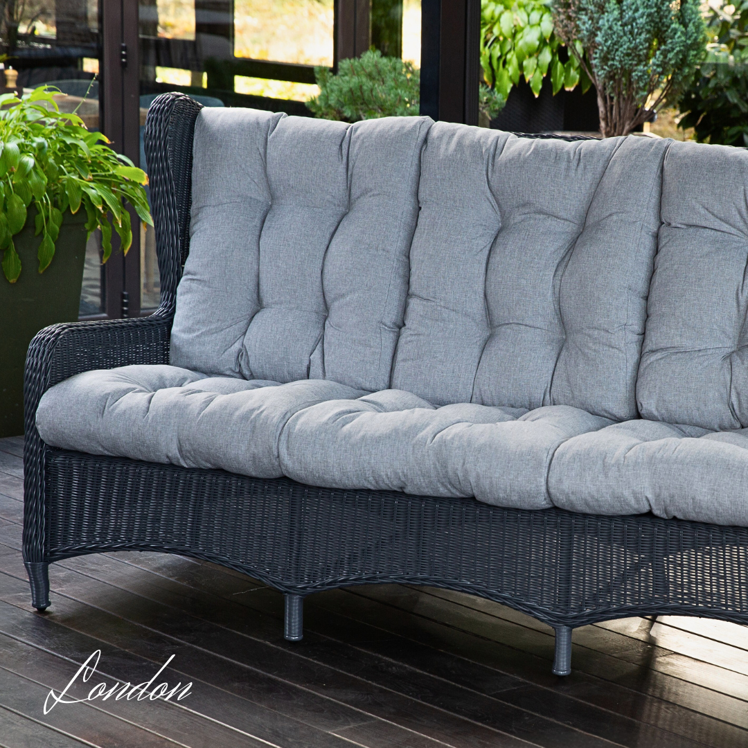Velká třímístná pohovka z umělého ratanu LONDON Terico. Ratan v grafitové barvě. Šedé polštáře a mat