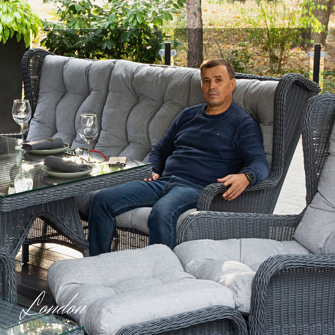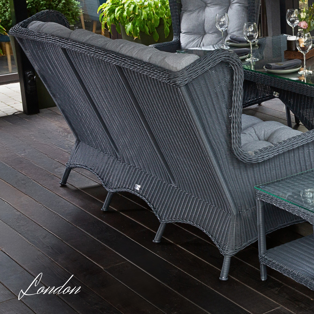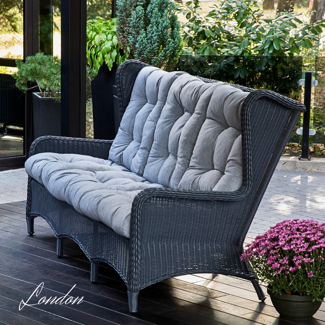 Velká třímístná pohovka z umělého ratanu LONDON Terico. Ratan v grafitové barvě. Šedé polštáře a mat