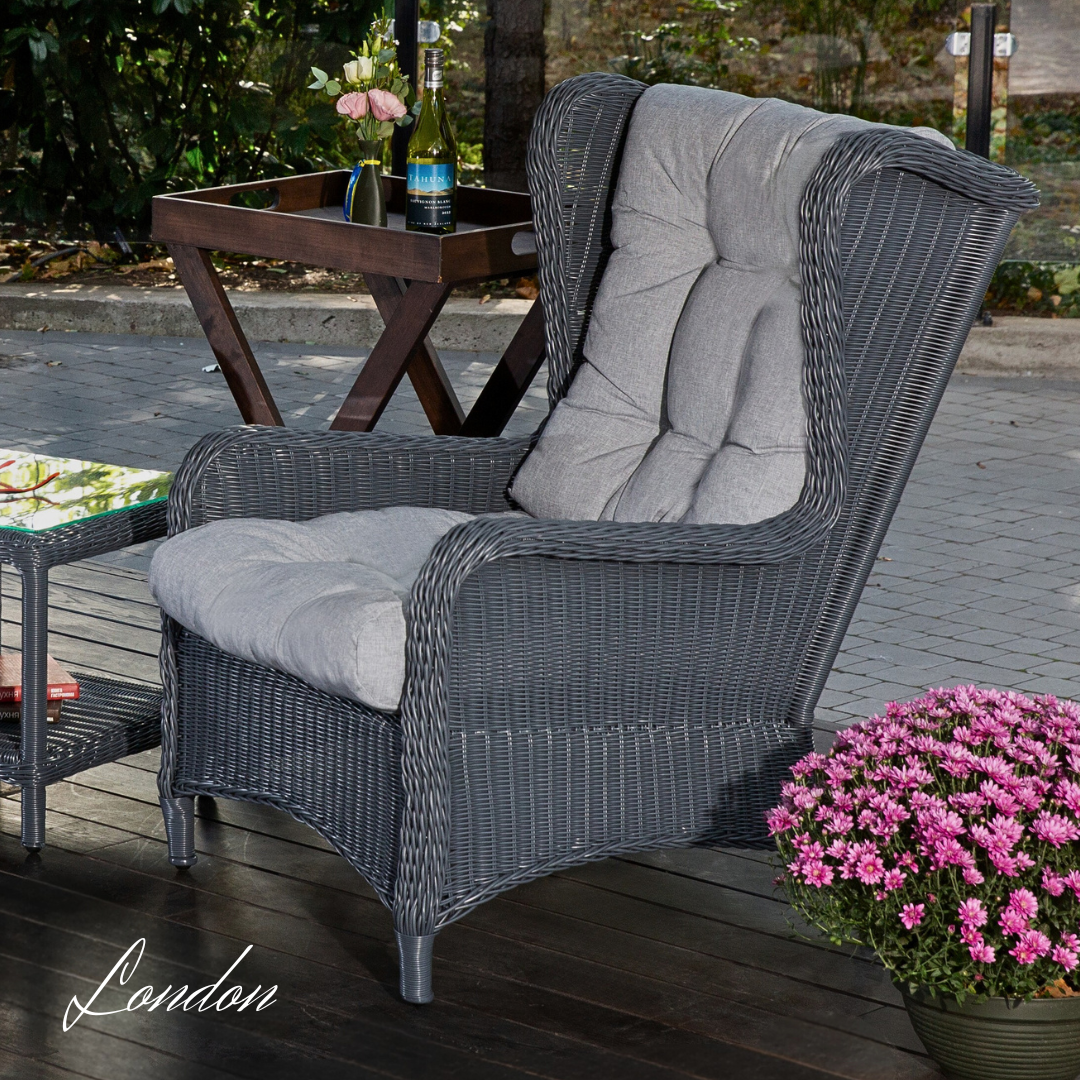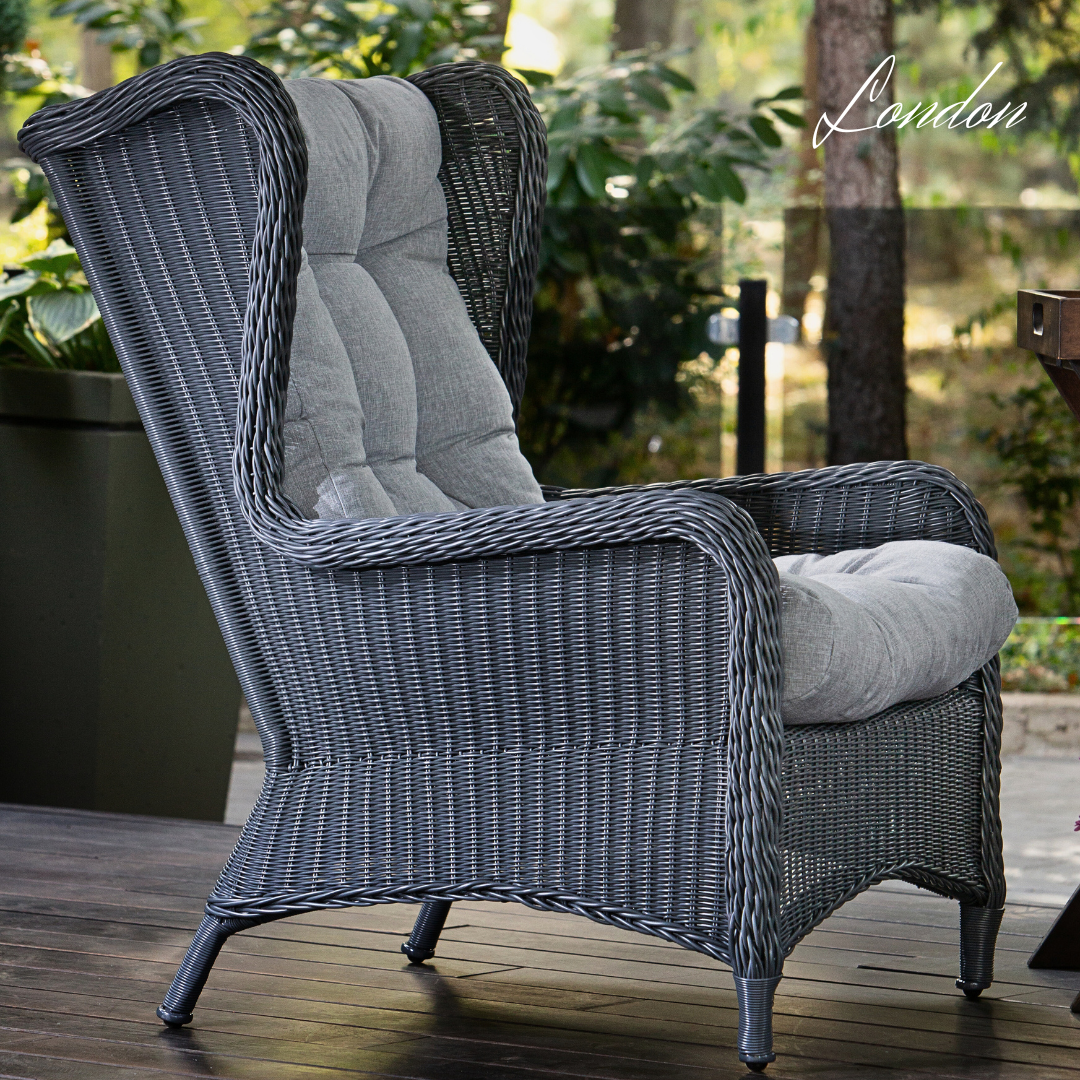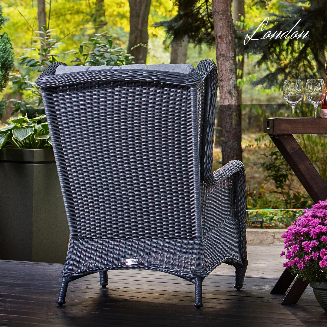 Velké křeslo z umělého ratanu LONDON Terico. Ratan v grafitové barvě. Šedé polštáře a matrace.