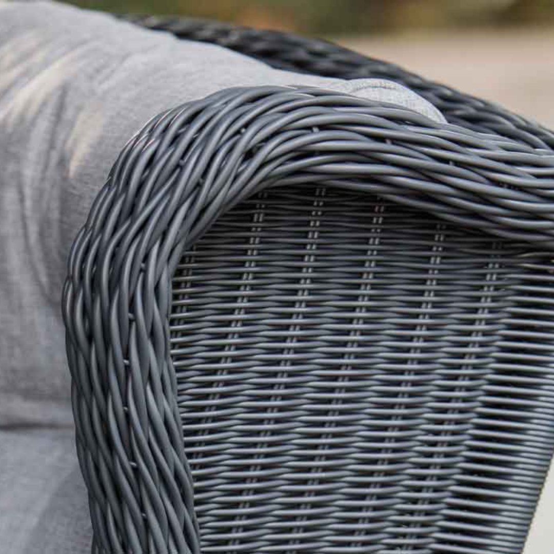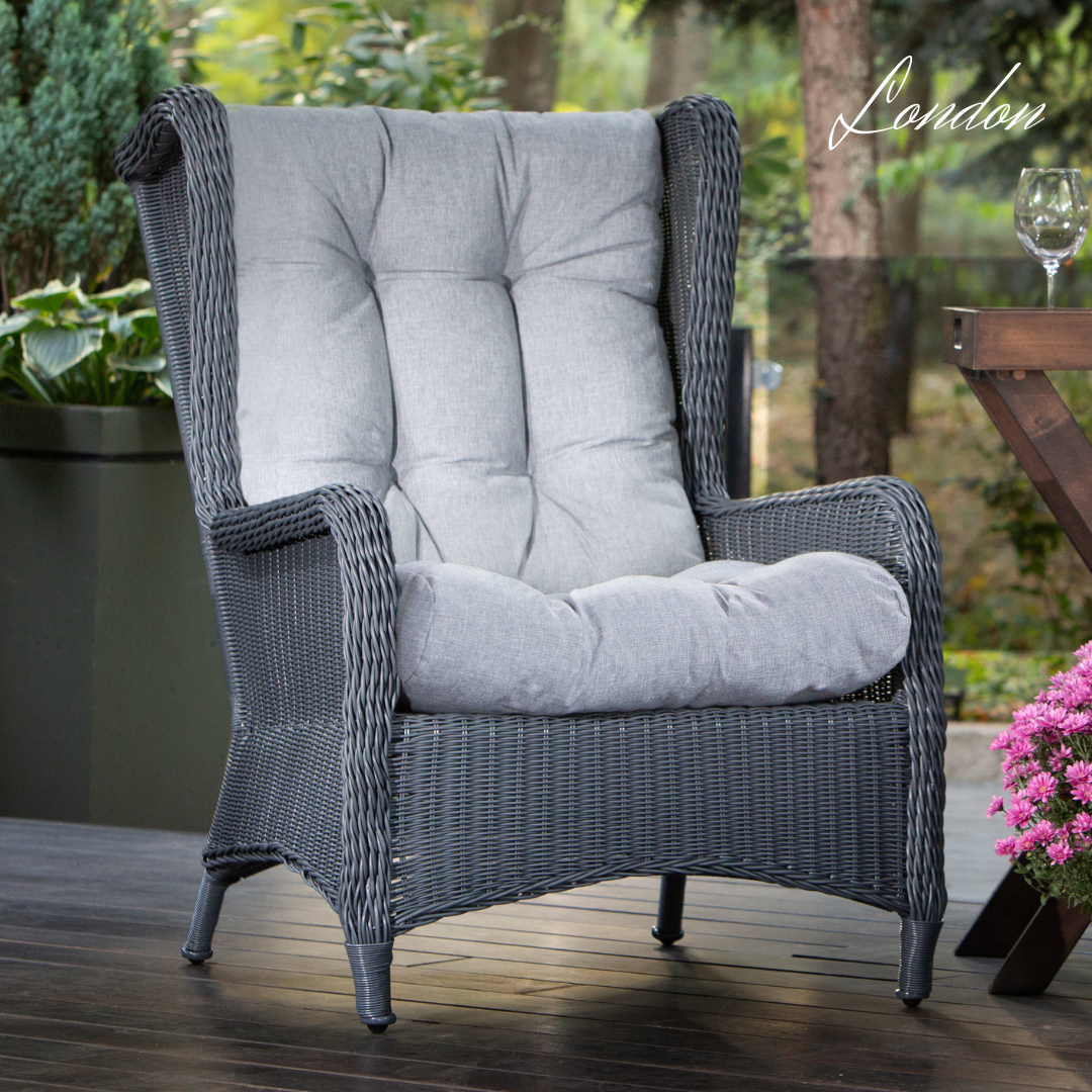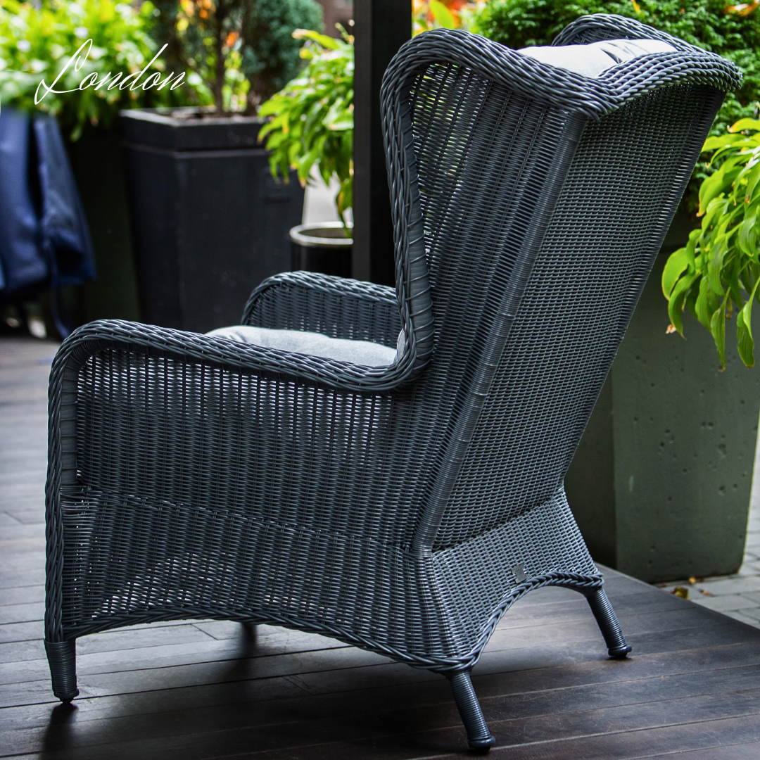 Velké křeslo z umělého ratanu LONDON Terico. Ratan v grafitové barvě. Šedé polštáře a matrace.