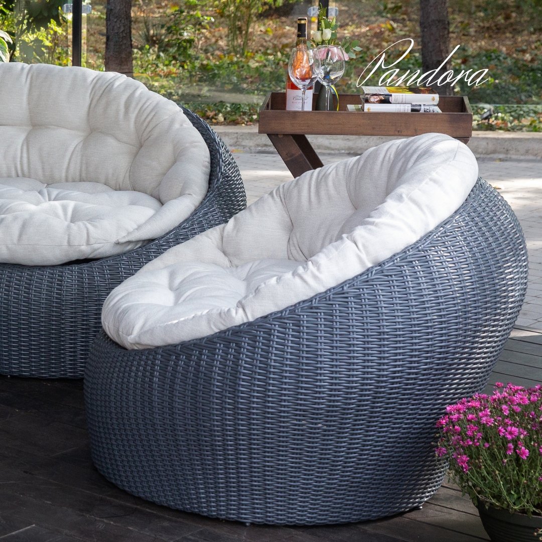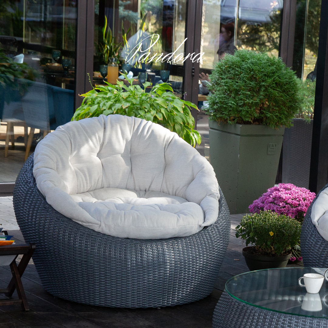 Velké křeslo z umělého ratanu PANDORA Terico. Ratan v grafitové barvě. Šedé polštáře a matrace.