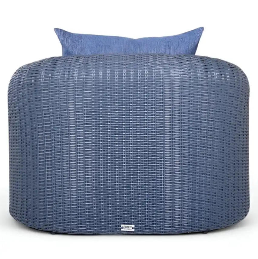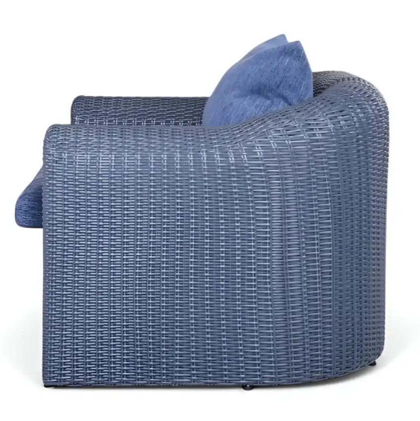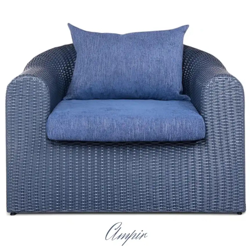 Velké pletené křeslo z umělého ratanu AMPIR Terico. Ratan v grafitové barvě. Modré polštáře a matrac