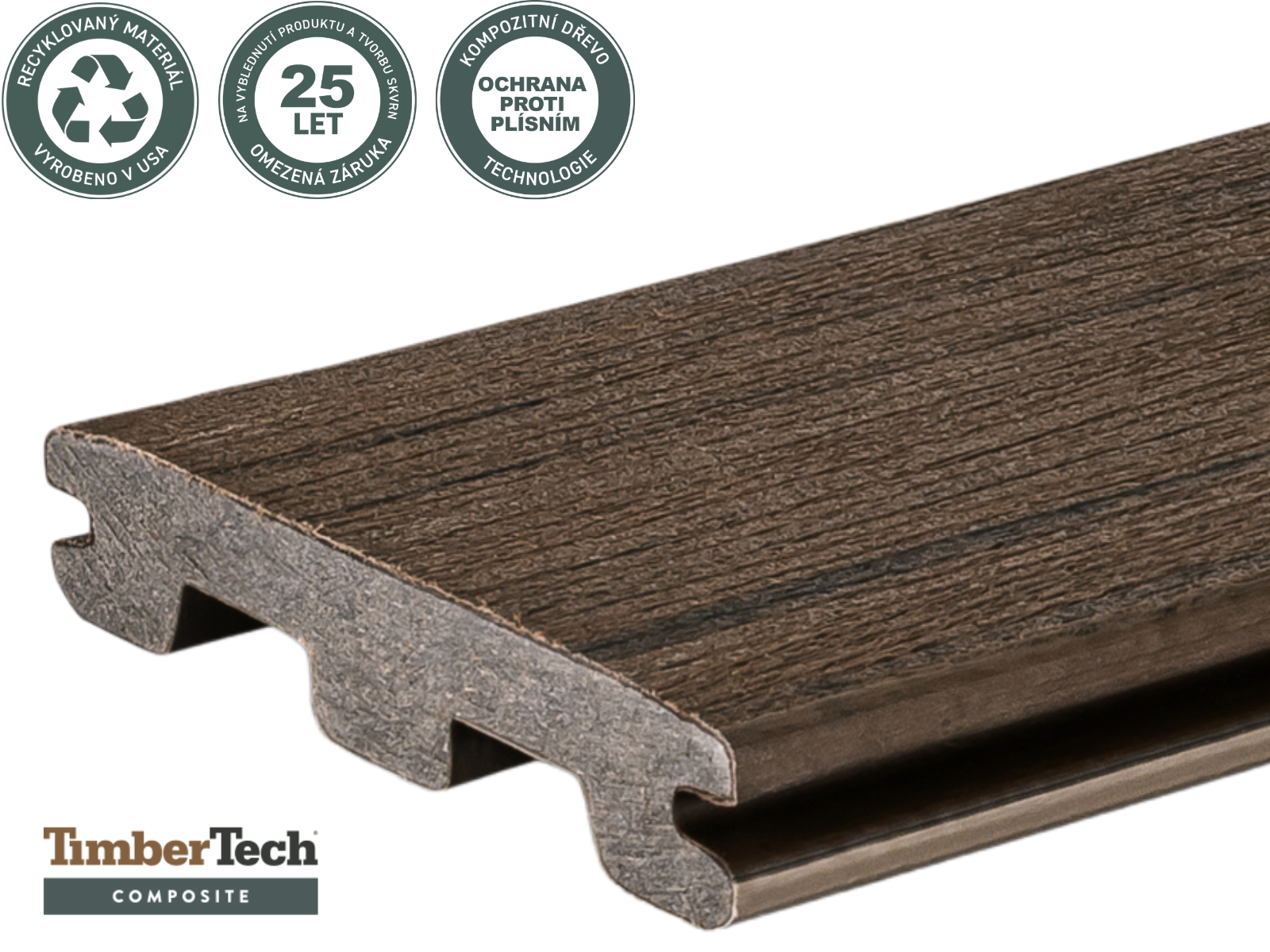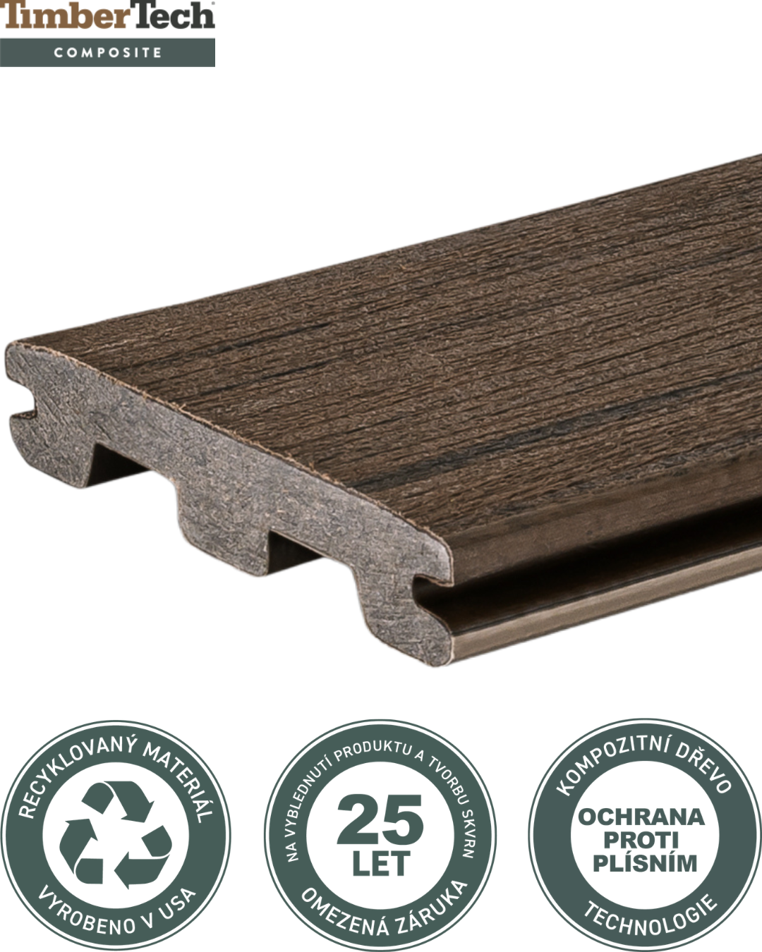 **WPC prkno TimberTech Prime+ – Hnědé / Dark Cocoa**. Špičkové bezúdržbové řešení pro moderní terasy. Kombinuje teplý odstín exotického dřeva s extrémní odolností polymerové ochrany.